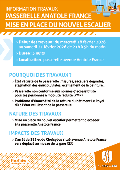 Les travaux de la passerelle avenue Anatole France se poursuivent. Place à l’installation du nouvel escalier du mercredi 18 février au samedi 21 février, de 21h à 5h du matin !