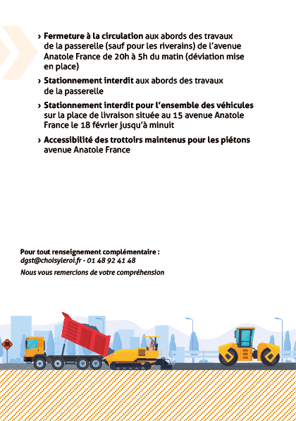 - Fermeture à la circulation aux abords des travaux de la passerelle (sauf pour les riverains) de l’avenue Anatole France de 20h à 5h du matin (déviation mise en place)